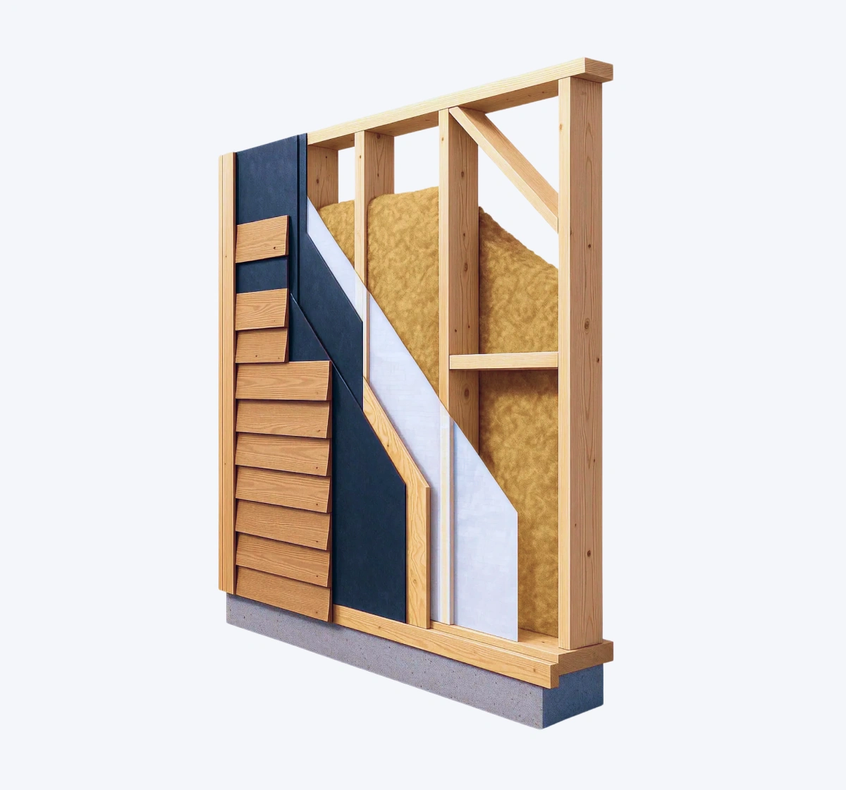Les parois de l’enveloppe intérieure sont composées de couches successives assurant la protection contre les intempéries, l’isolation thermique et acoustique … L’ensemble est contreventé par des panneaux en particules, puis reçoit parements, bardages ou enduit qui assurent la finition et l’esthétique.